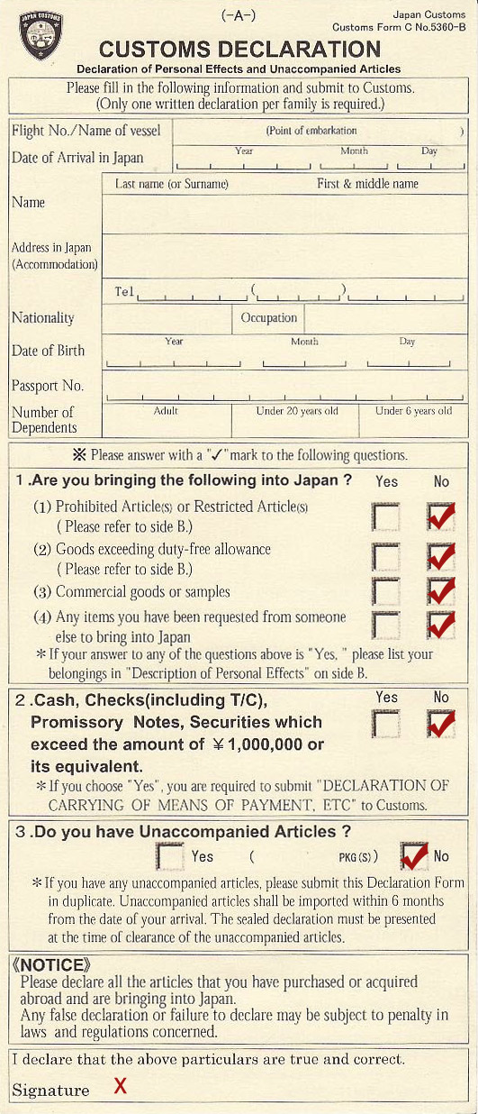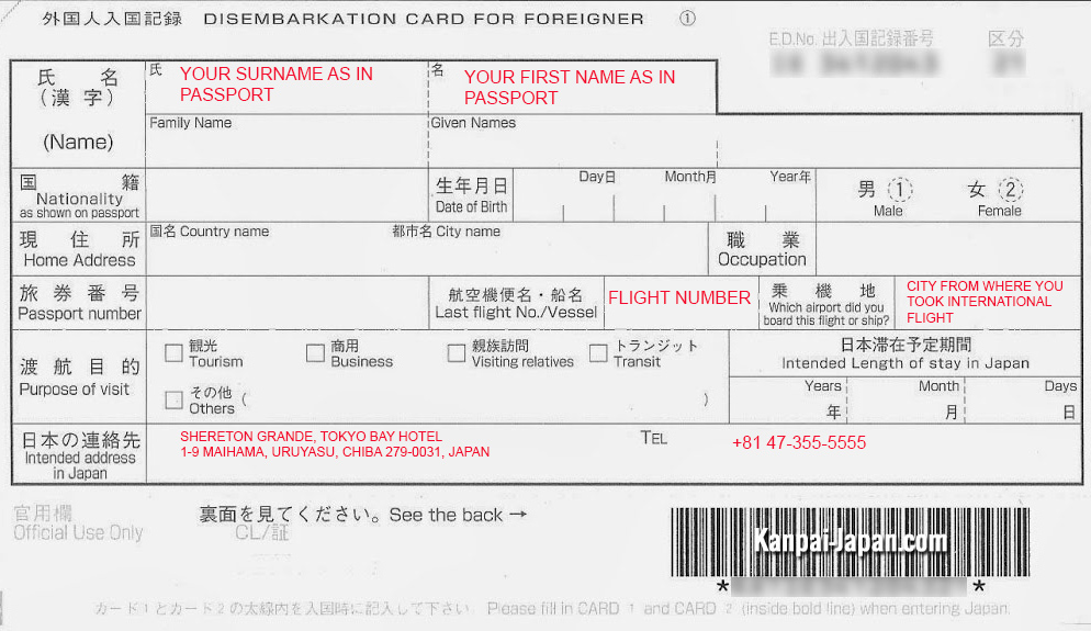 About one hour before landing in Japan, the cabin crew hands out small cards to passengers. These bilingual Japanese and English documents are called the Japanese Disembarkation Card for Foreigners. Filling them in is compulsory before going through Japanese immigration and customs services